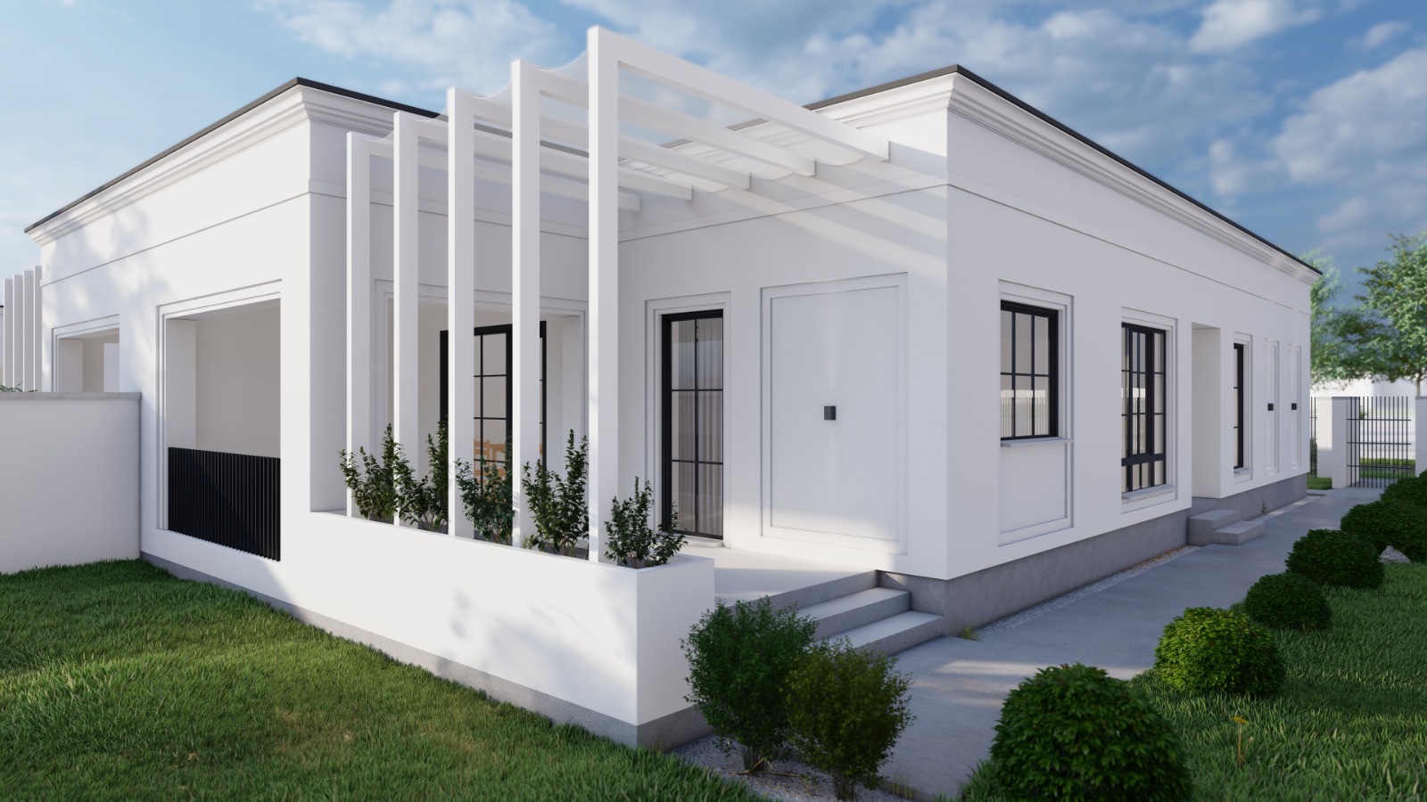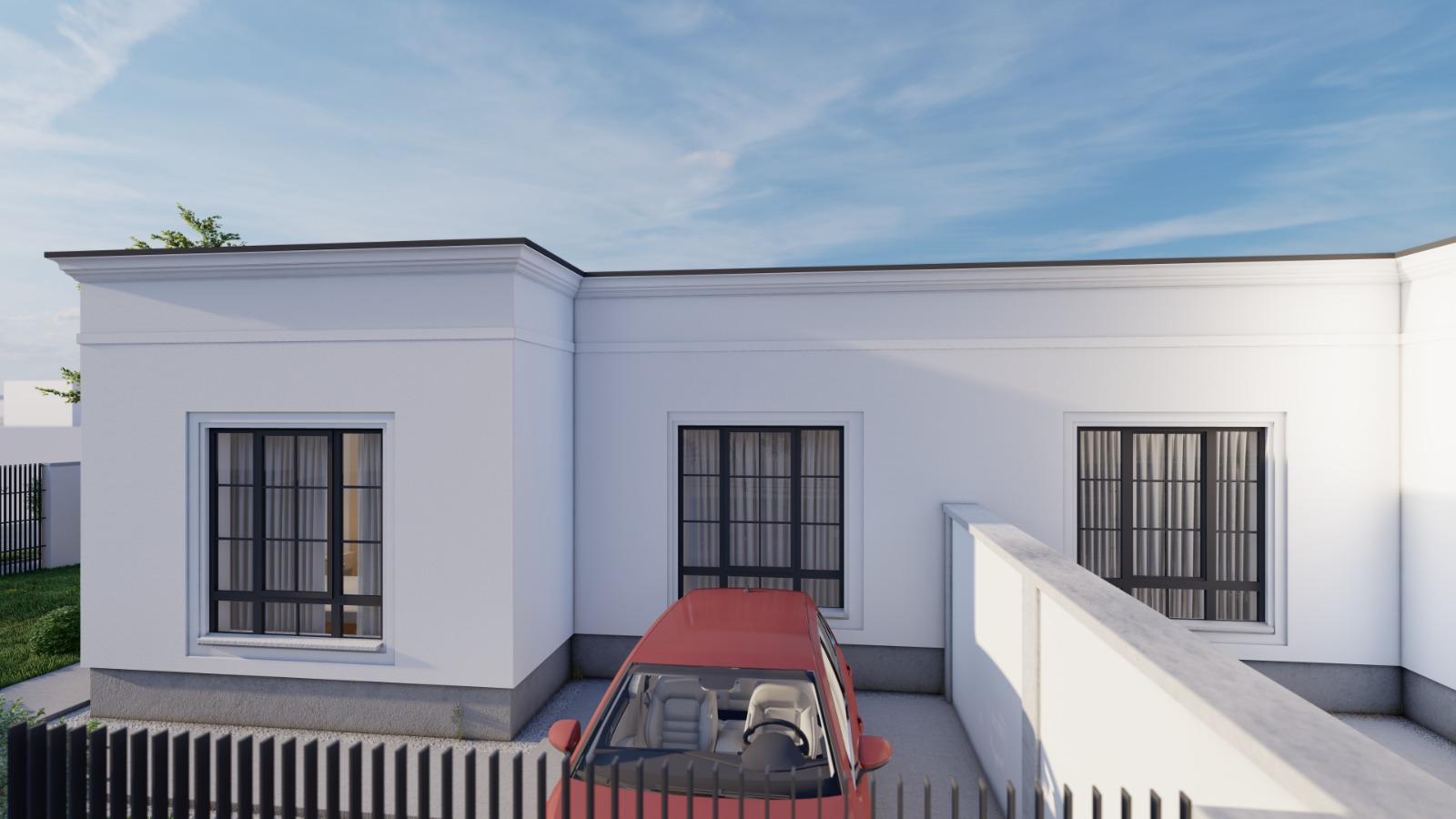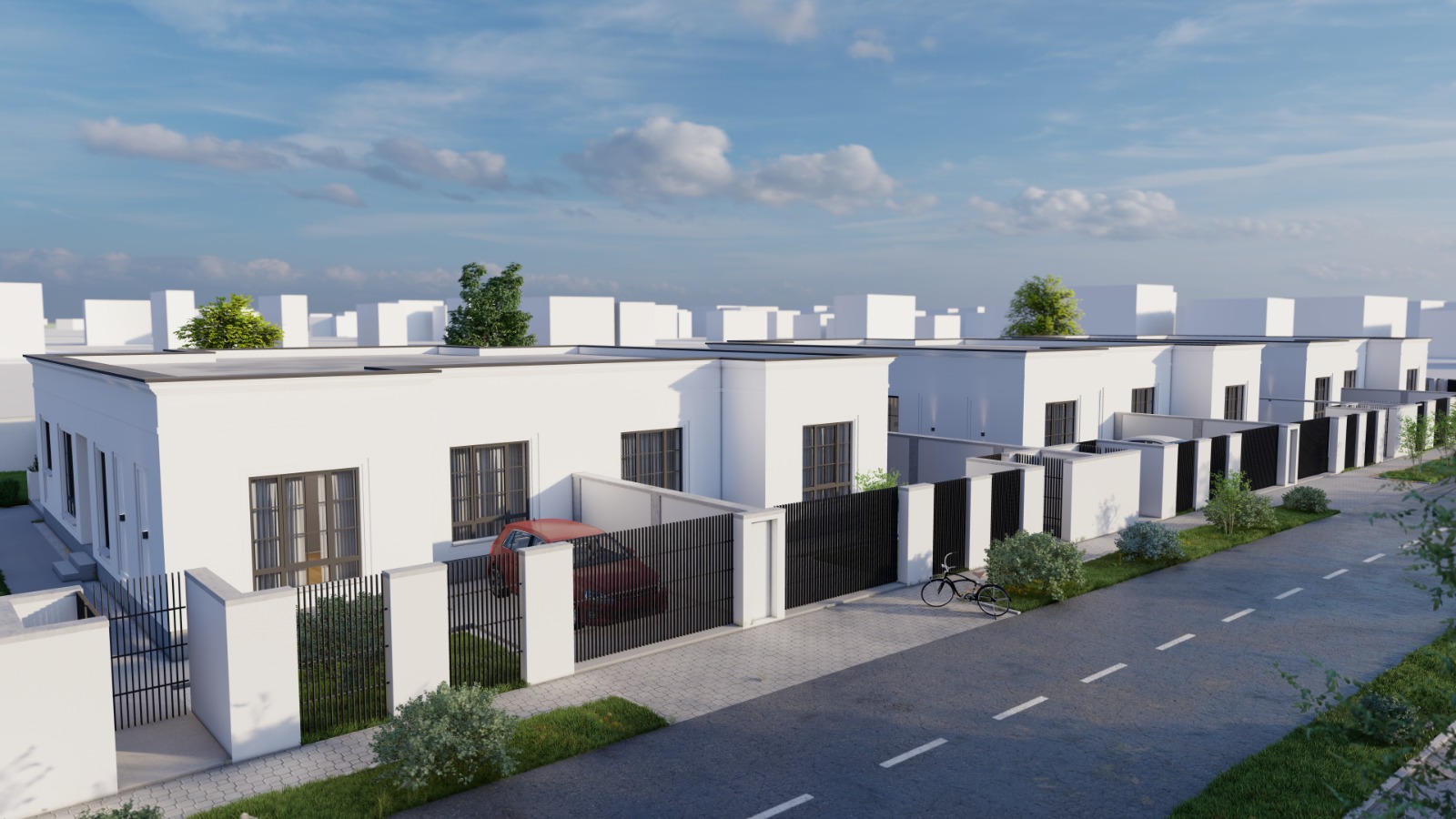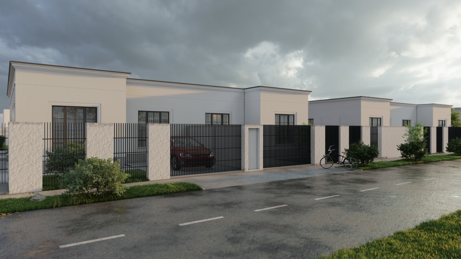 Curtea fiecărei case tip duplex pe care o construim este nivelată, amenajată cu gazon de tip rulou, plante ornamentale, alei cu pavaj, sistem de irigație și grătar.